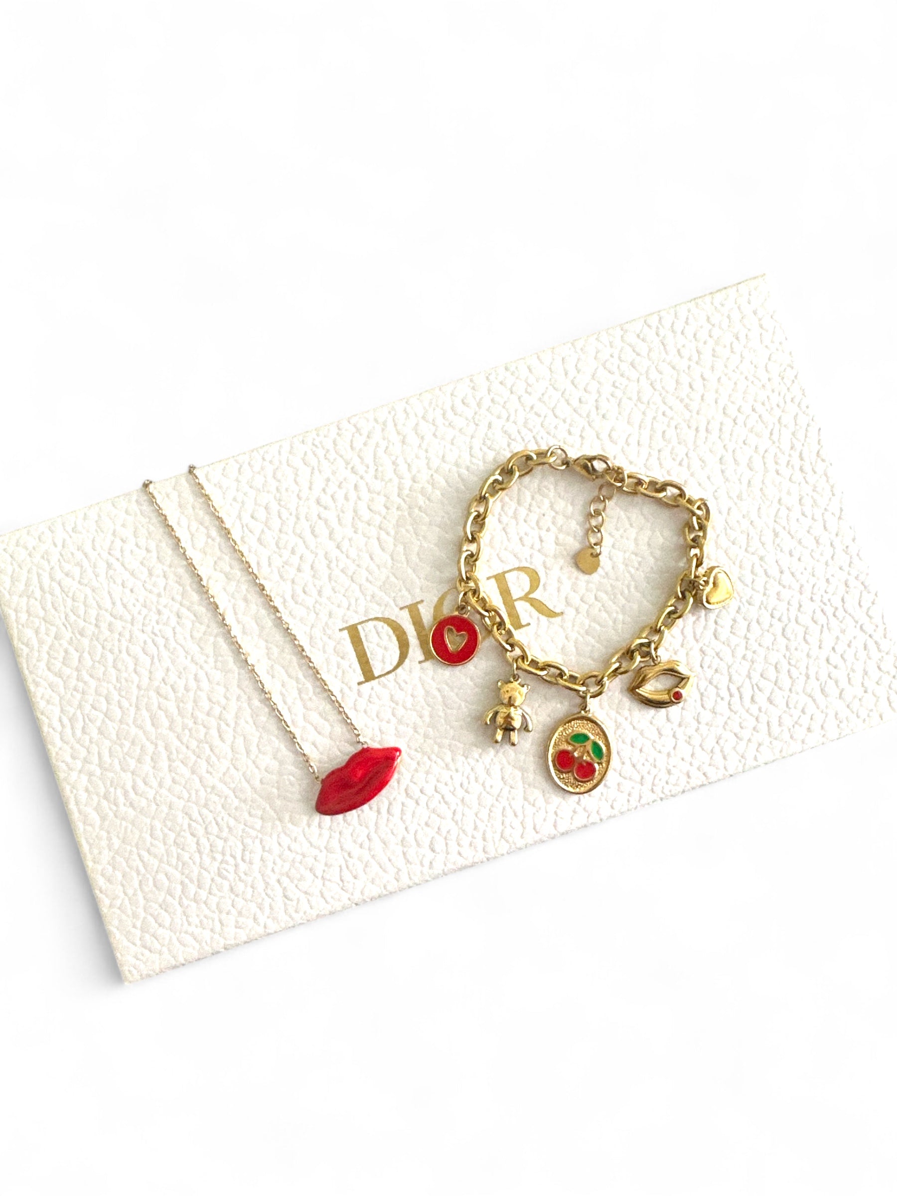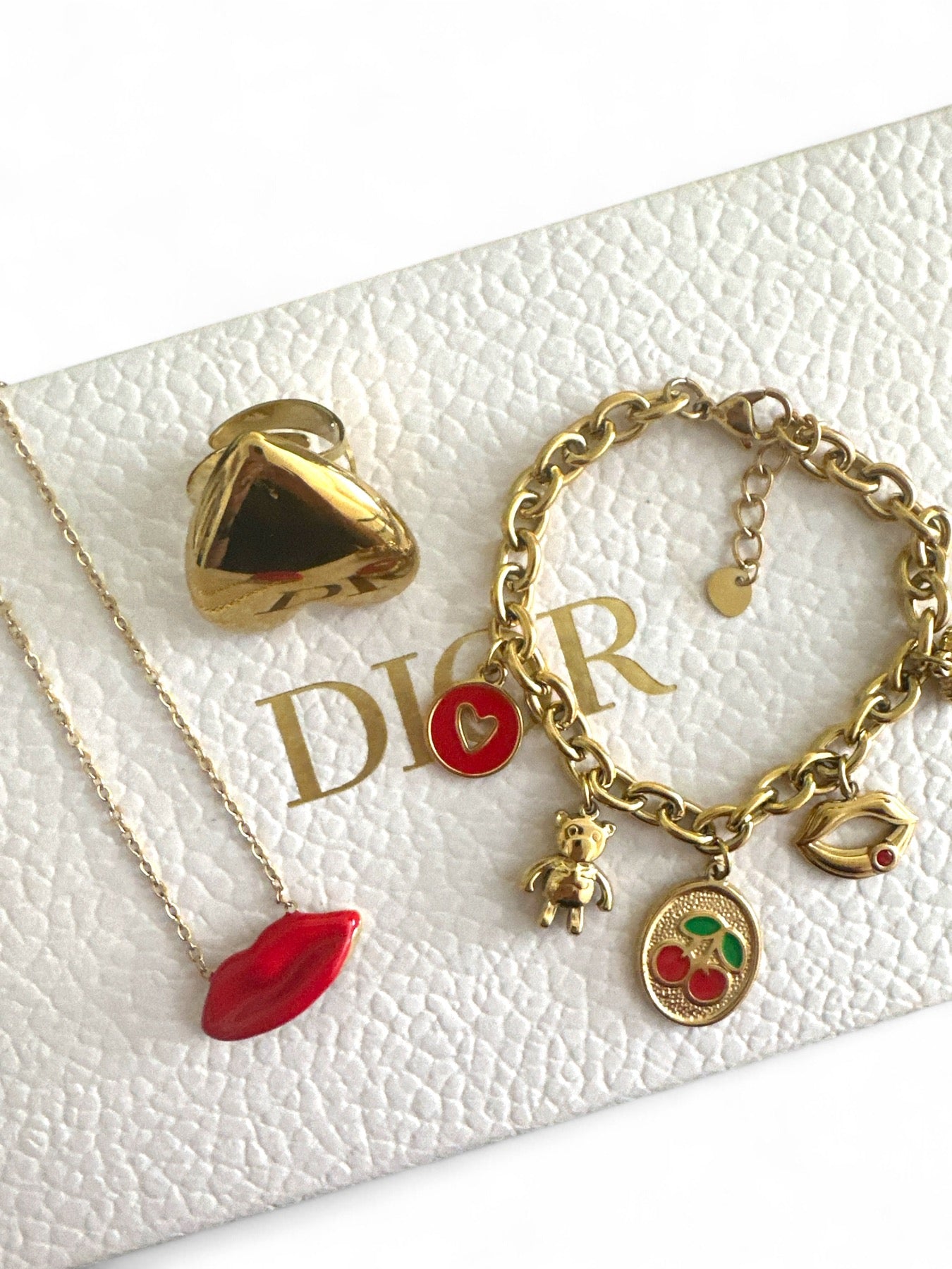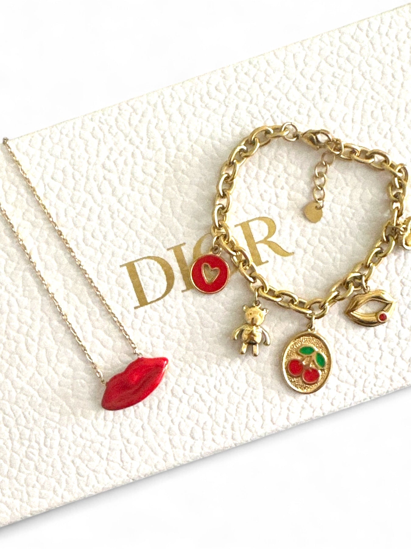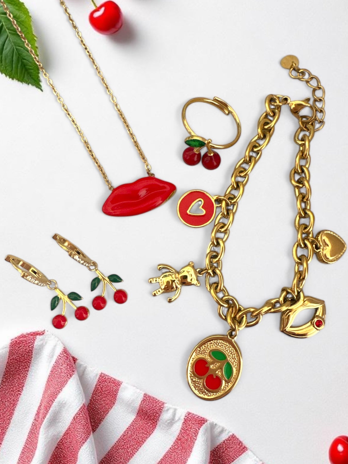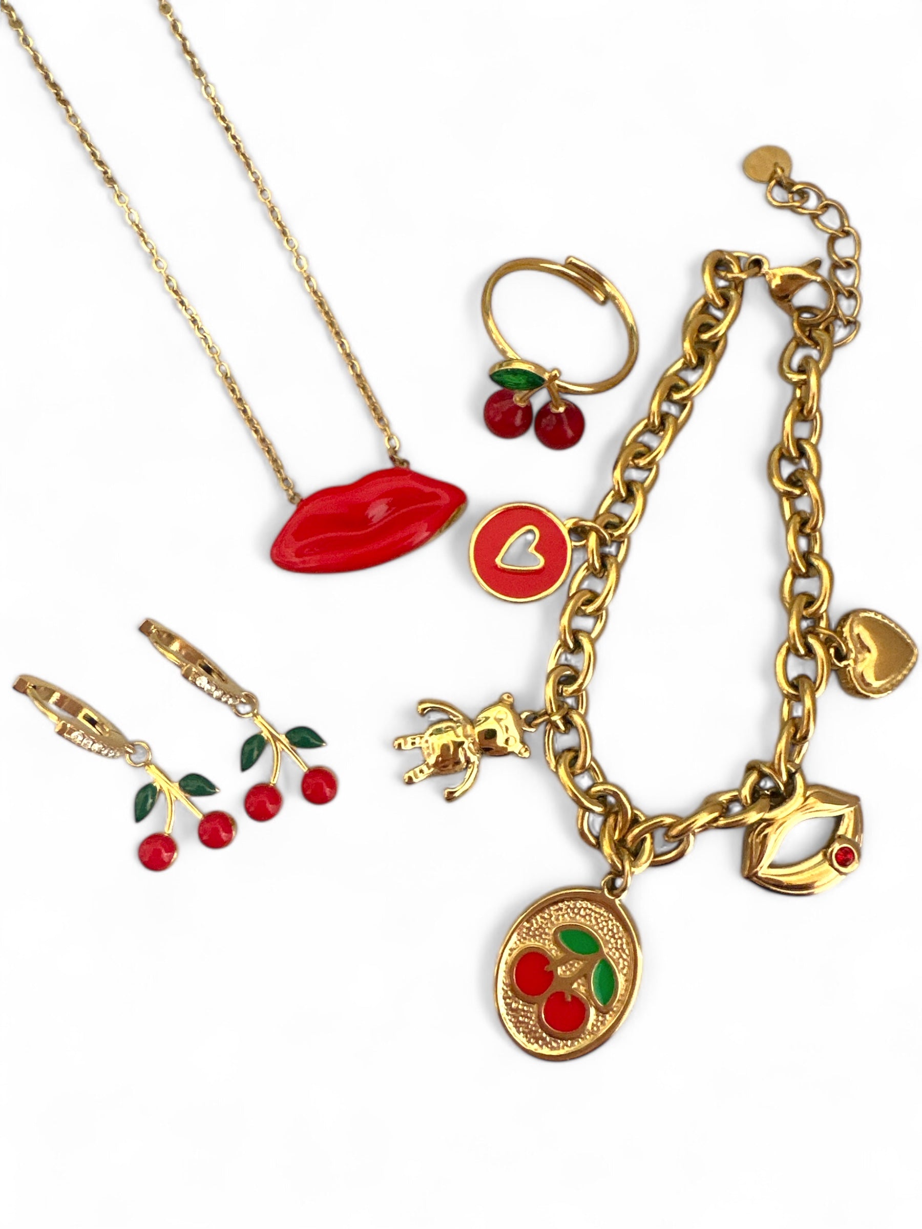 Κόκκινα χειλάκια σε enamel φινίρισμα κρέμονται παιχνιδιάρικα από χρυσή αλυσίδα από ανοξείδωτο ατσάλι — και σε προκαλούν να τους αντισταθείς.