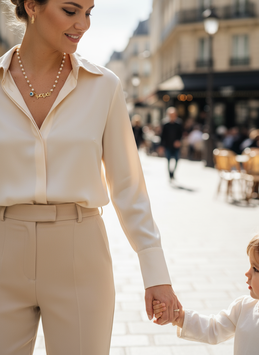 🤍✨ Μαμά Necklace – Χειροποίητο Κολιέ με Πέρλες, Ταυτότητα & Ματάκι