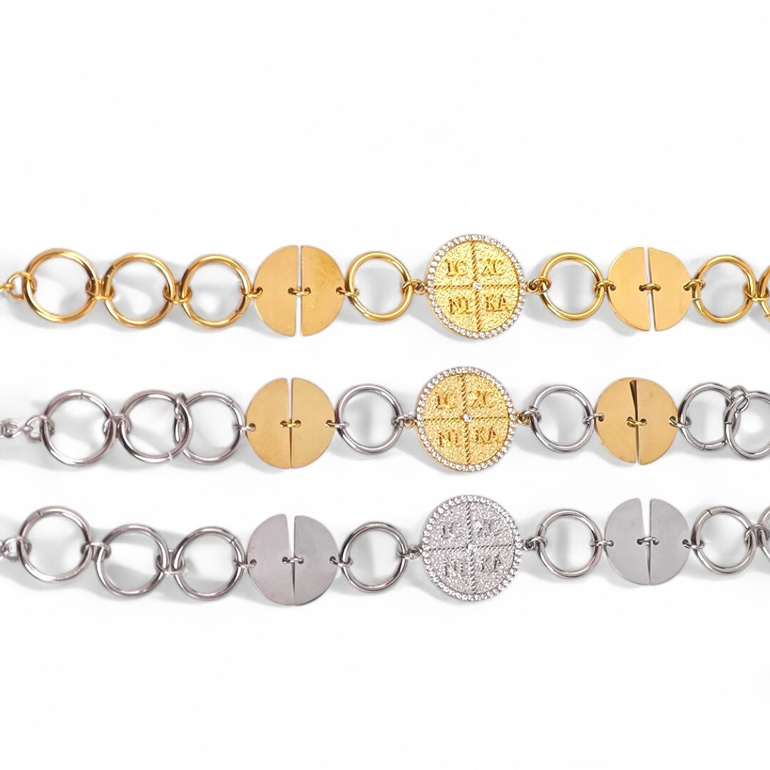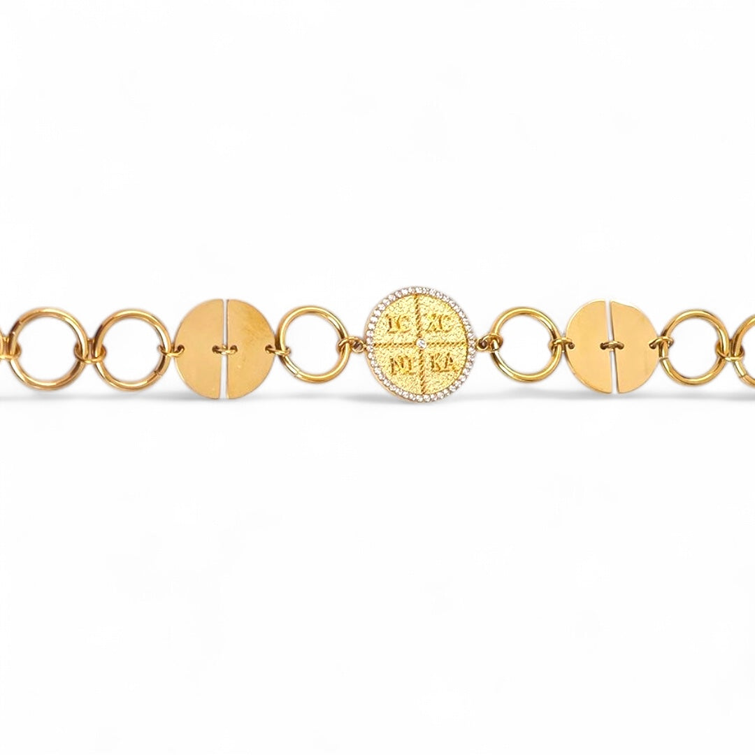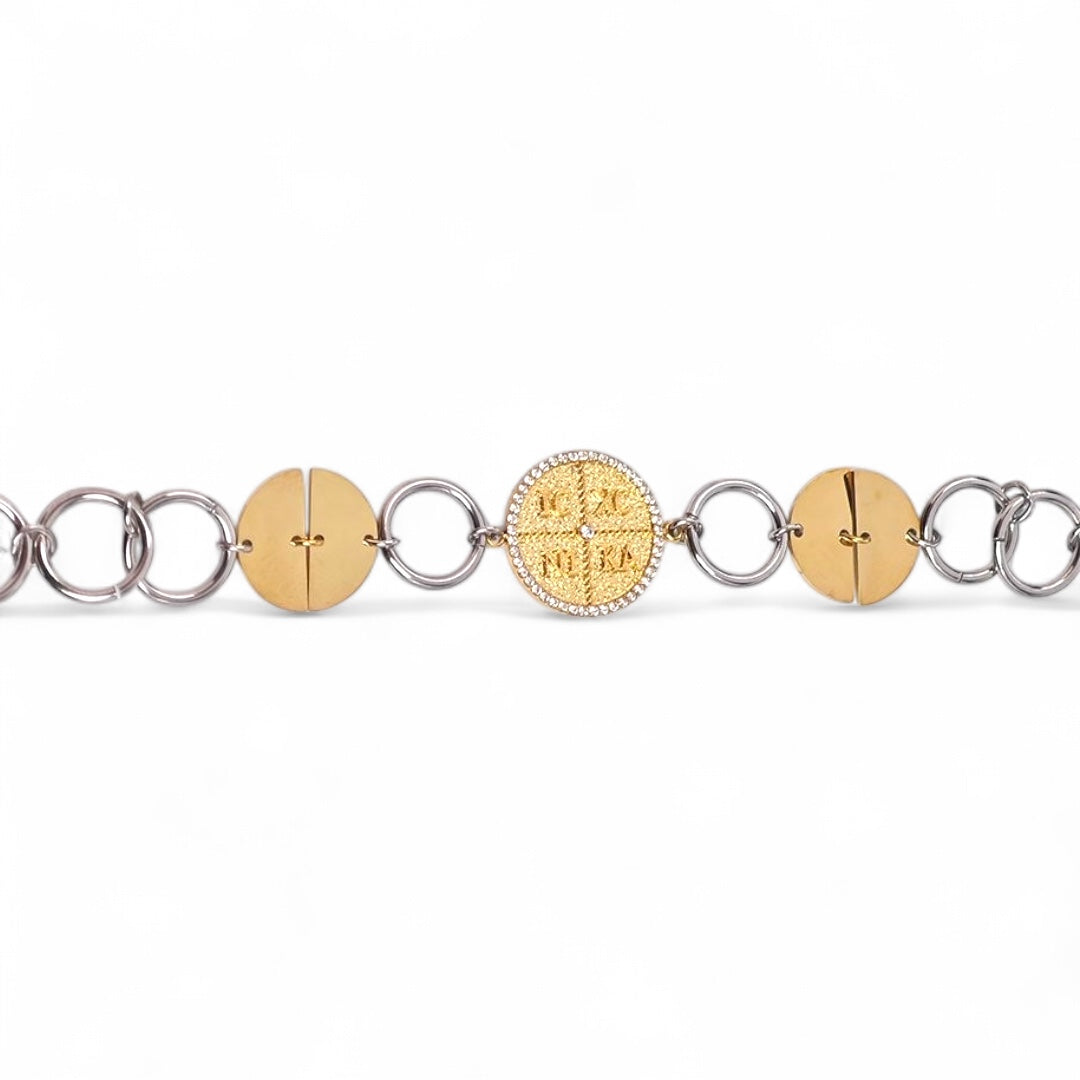 Statement βραχιόλι από ατσάλι, με συνδυασμό ασημί κρίκων και χρυσών δίσκων, στο κέντρο του οποίου δεσπόζει μοτίφ κωνσταντινάτου με ανάγλυφο IC XC NI KA και περίγραμμα από ζιργκόν. Ένα κομμάτι που συνδυάζει τη συμβολική προστασία με το σύγχρονο fashion ύφος.