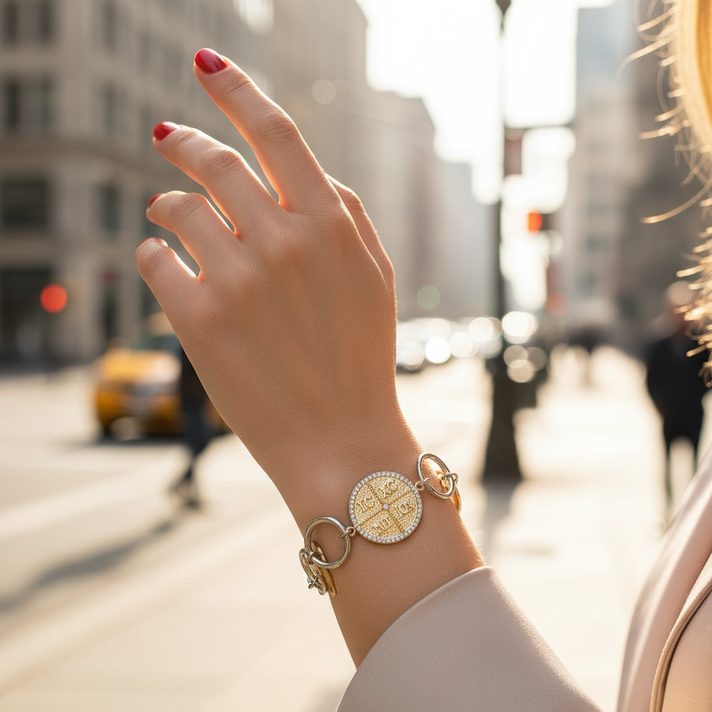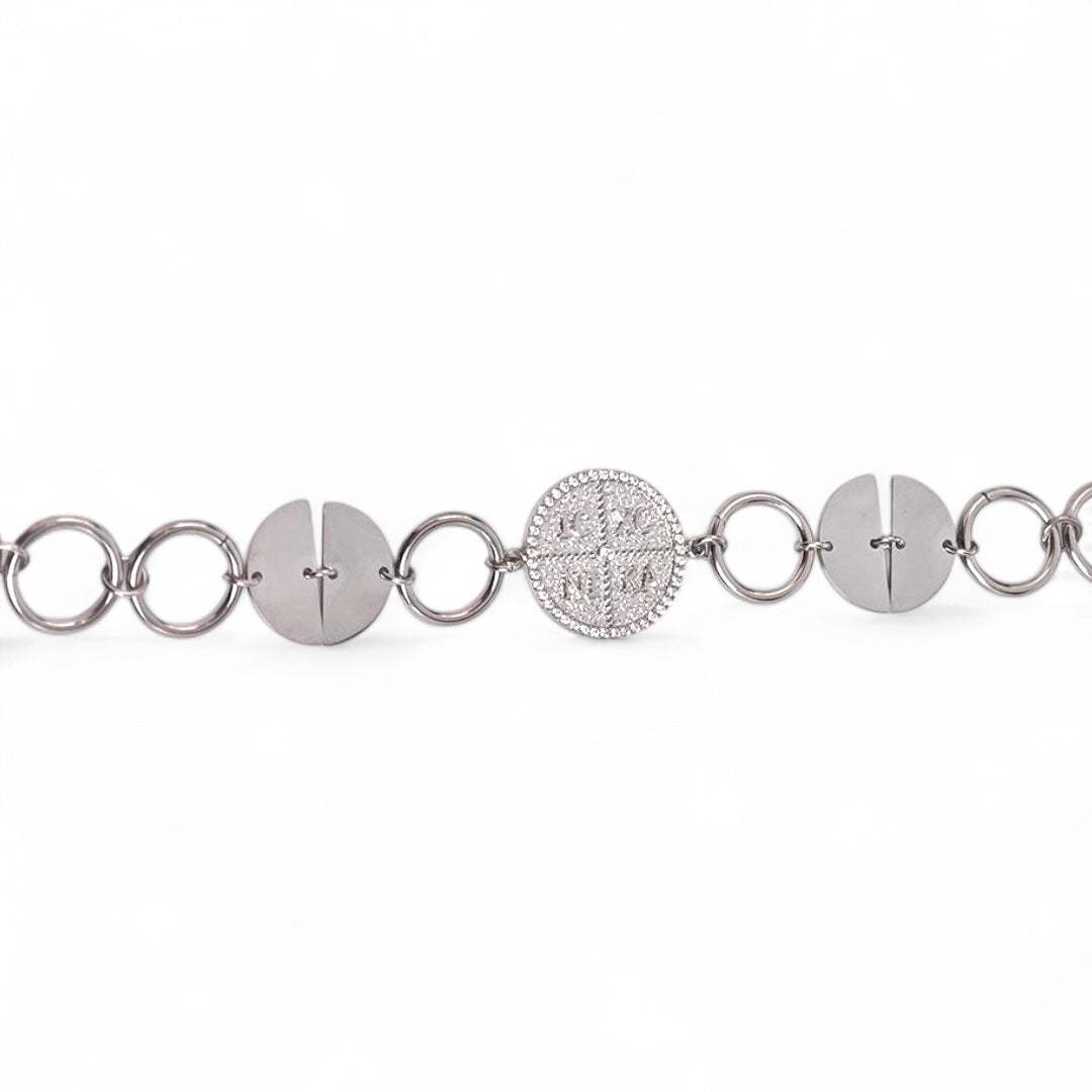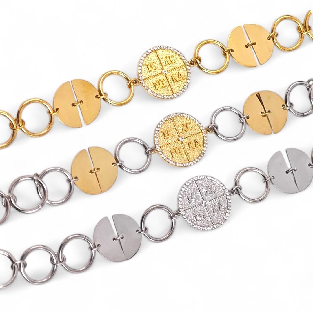 Statement βραχιόλι από ατσάλι, με συνδυασμό ασημί κρίκων και χρυσών δίσκων, στο κέντρο του οποίου δεσπόζει μοτίφ κωνσταντινάτου με ανάγλυφο IC XC NI KA και περίγραμμα από ζιργκόν. Ένα κομμάτι που συνδυάζει τη συμβολική προστασία με το σύγχρονο fashion ύφος.
