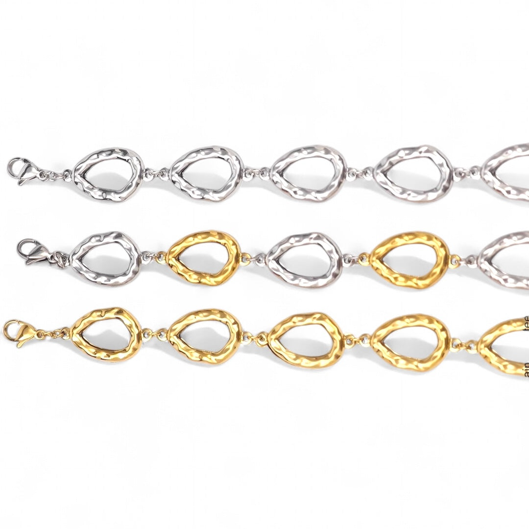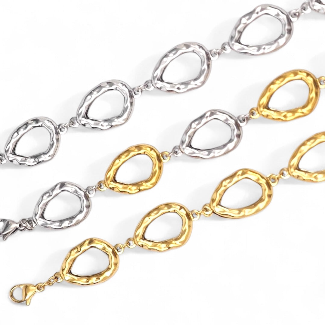 Minimal με artistic twist, το “Molten Ovals” είναι ένα σύγχρονο βραχιόλι που δίνει στυλ χωρίς φλυαρία. Η αλυσίδα αποτελείται από ανάλαφρα, οργανικά οβάλ στοιχεία με σφυρήλατη υφή, αποπνέοντας χειροποίητη αισθητική και δυναμική κομψότητα.