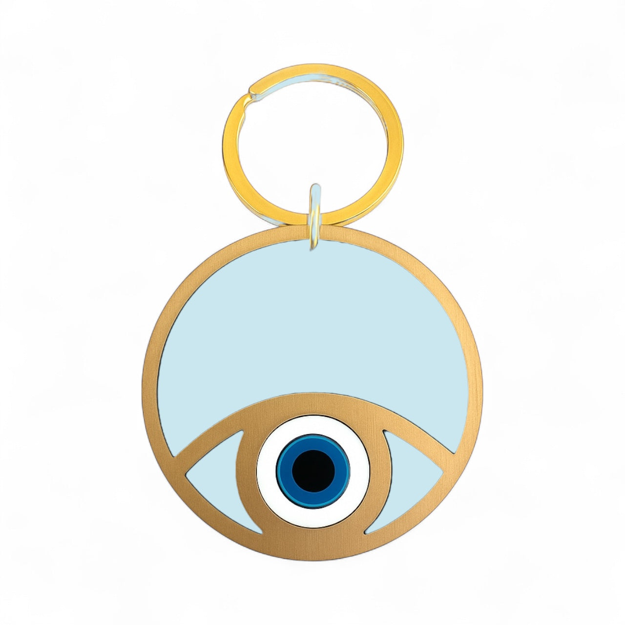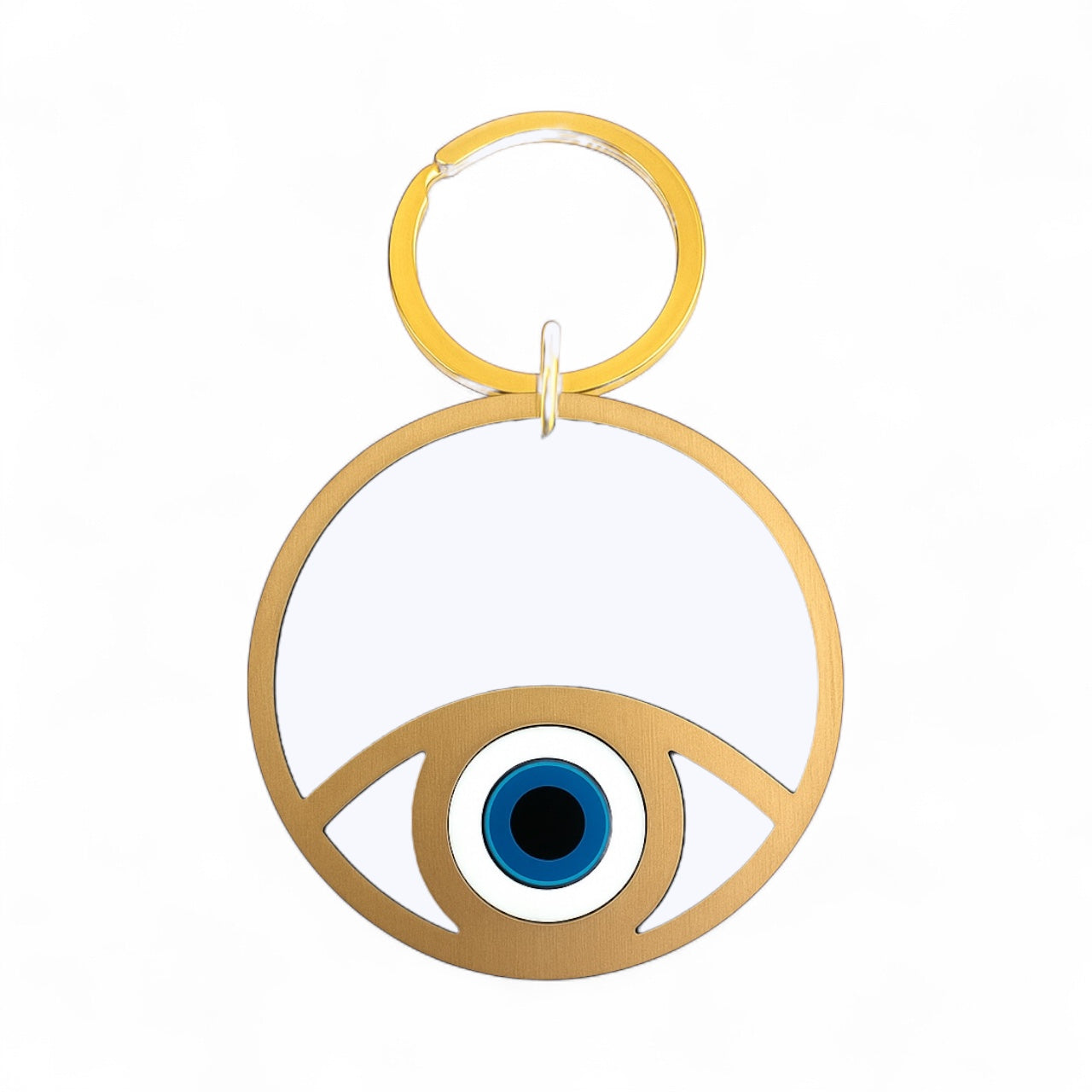 Premium χειροποίητο μπρελόκ με μοτίφ μάτι από plexiglass και χρυσό μεταλλικό δαχτυλίδι.