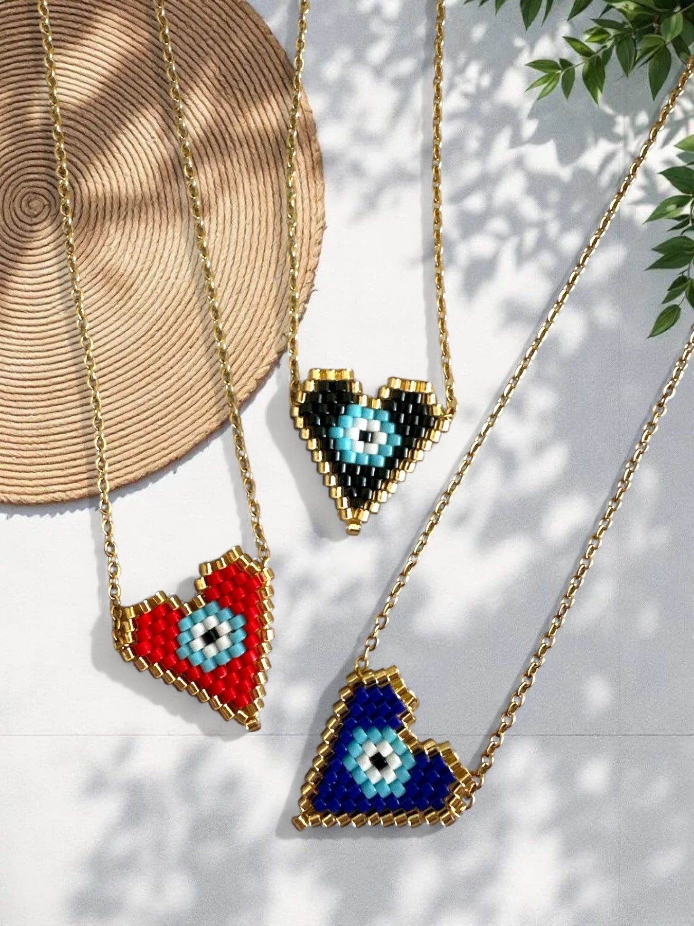 Κολιέ με μοναδικό V-σχήμα «pixel heart» — υφασμένο στο χέρι με ιαπωνικές Miyuki Delica που σχηματίζουν ματάκι στο κέντρο. Τετράγωνα χρυσά cube beads πλαισιώνουν το μοτίβο για έξτρα λάμψη, ενώ η ατσάλινη (stainless-steel) αλυσίδα υπόσχεται αντοχή σε θάλασσα, ιδρώτα και… καλοκαιρινά ξενύχτια.