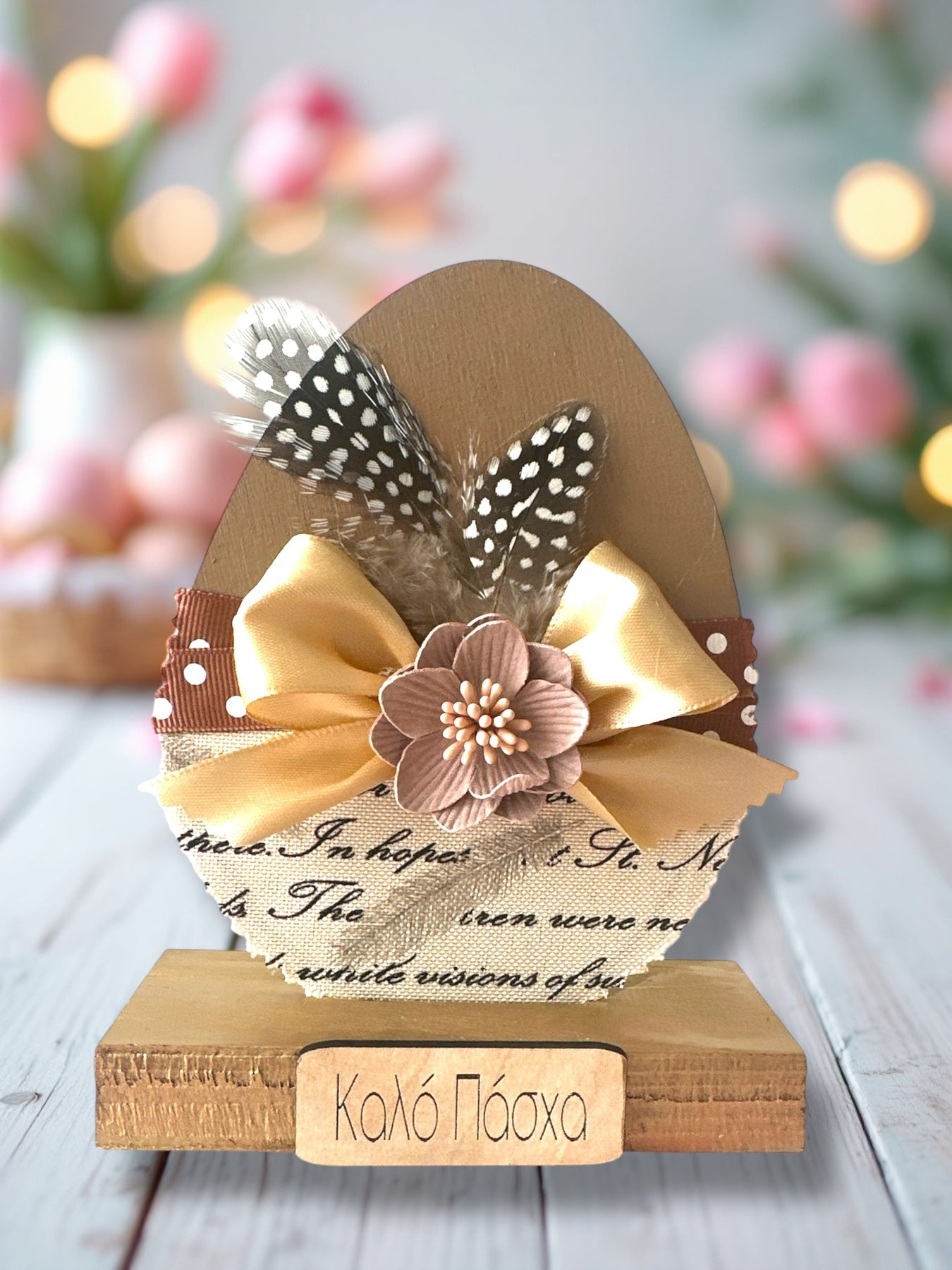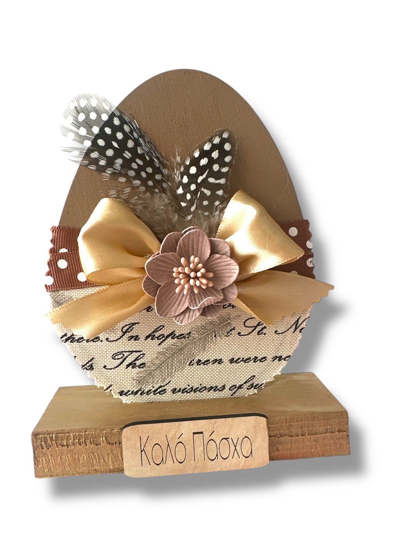 Χειροποίητο διακοσμητικό αυγό σε βάση από ξύλο, βαμμένο στο χέρι και στολισμένο με vintage ύφασμα, κορδέλες, λουλούδι από λινάτσα και φυσικά φτερά.