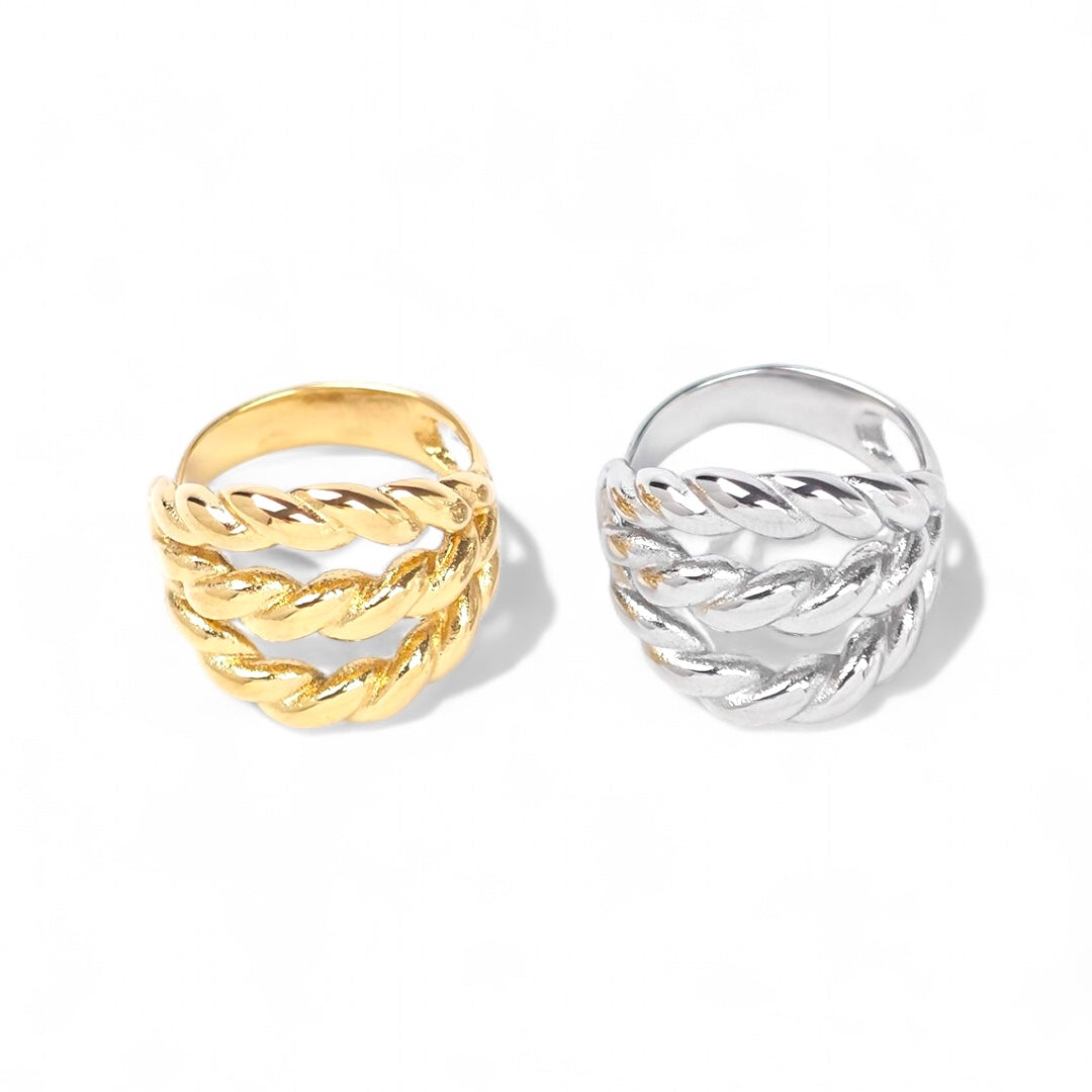 Δυναμικό, chunky και fashion-forward. Το “Rope Bold” είναι ένα εντυπωσιακό δαχτυλίδι από stainless steel με σχέδιο εμπνευσμένο από πλεγμένη αλυσίδα. Οι τρεις ανάγλυφες λωρίδες δημιουργούν την αίσθηση έντασης και δομής, ενώ το γυαλιστερό φινίρισμα προσθέτει κομψότητα και διαχρονικό στιλ.