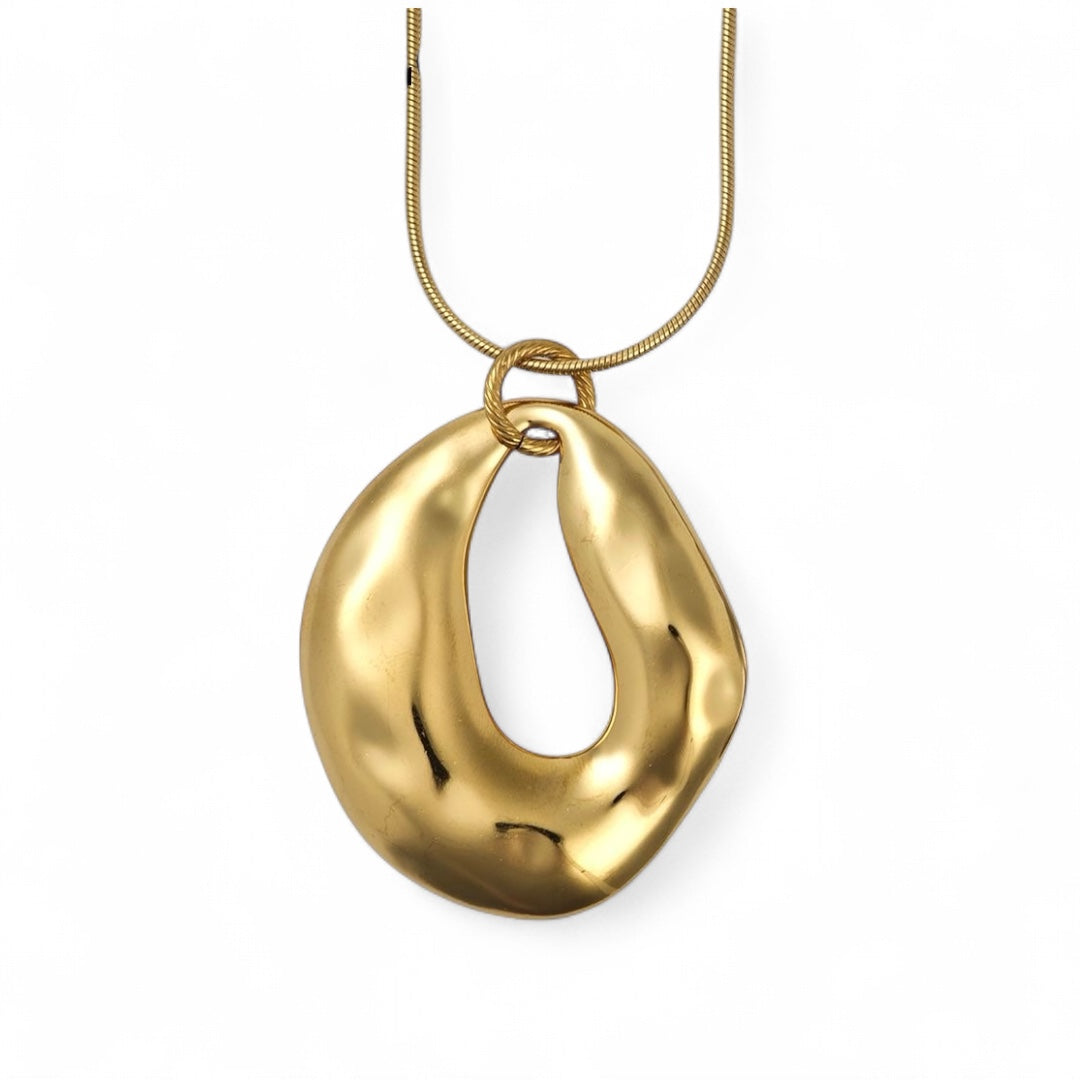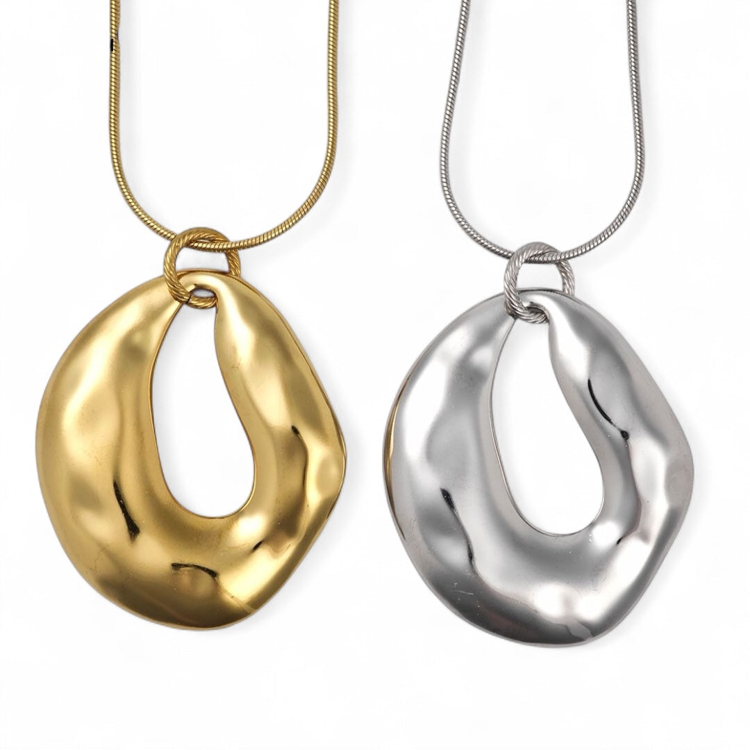 Το Sculptural Flow Necklace είναι ένα statement κολιέ εμπνευσμένο από οργανικές φόρμες και κυματισμούς της φύσης. Με μεγάλο, γυαλιστερό μενταγιόν σε ακανόνιστο σχήμα και μεταλλική “snake” αλυσίδα, αποπνέει δυναμισμό και κομψότητα ταυτόχρονα. Ιδανικό για layering αλλά και για εντυπωσιακές solo εμφανίσεις.
