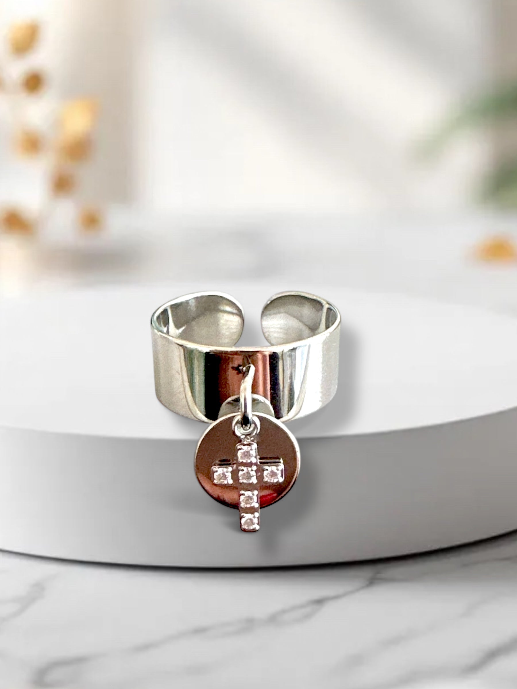 Το Shiny Cross Ring συνδυάζει το bold στιλ με μια sparkle λεπτομέρεια πίστης. Χρυσός ή ασημί κρίκος από ατσάλι, με λαμπερό charm-σταυρό που κουνιέται παιχνιδιάρικα σε κάθε σου κίνηση.