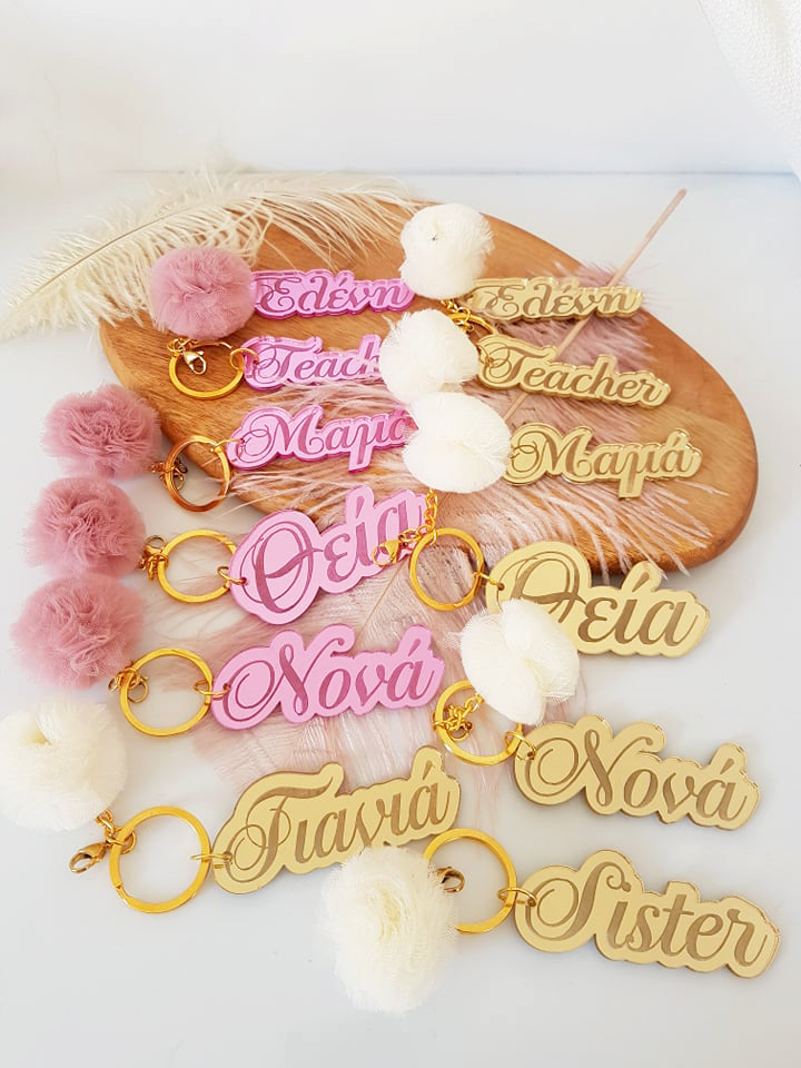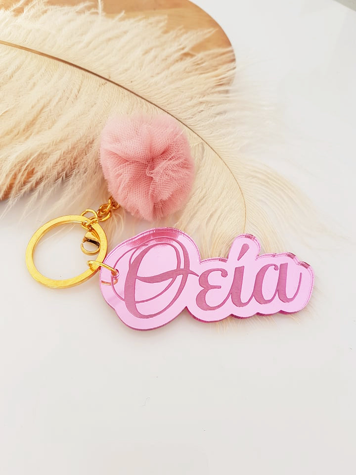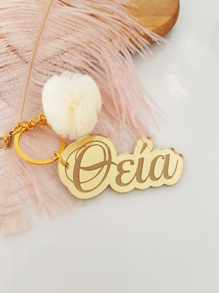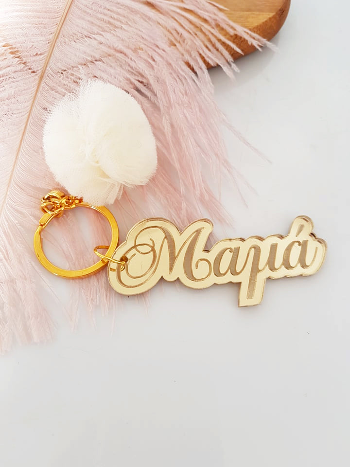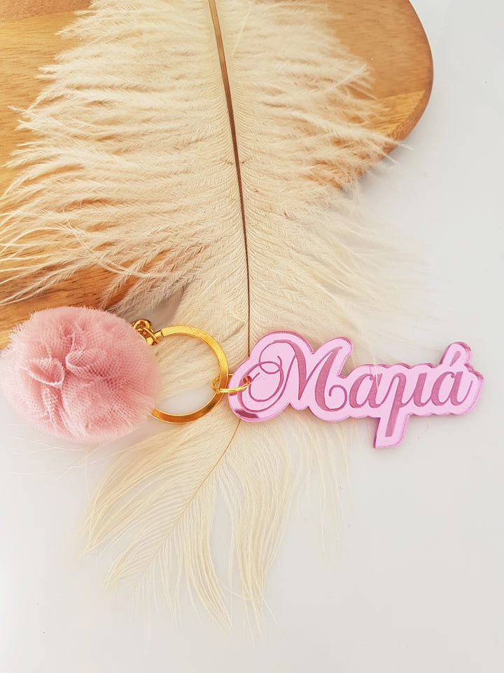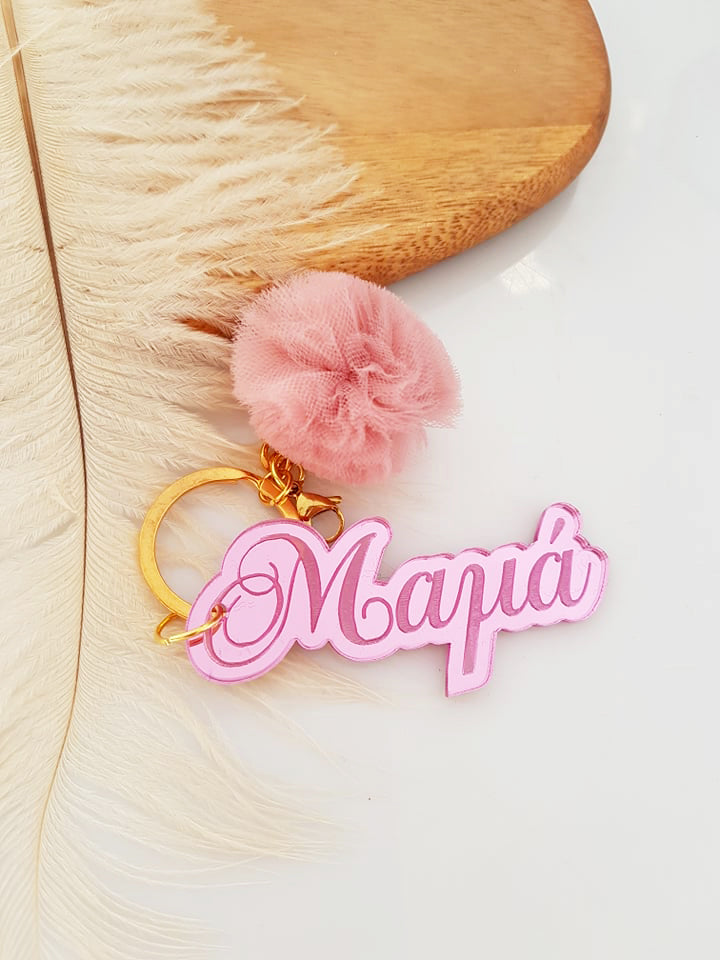 Μπρελόκ καθρέφτης με φουντάκι (μαμά, νονά, θεία, γιαγιά, sister, teacher, όνομα)