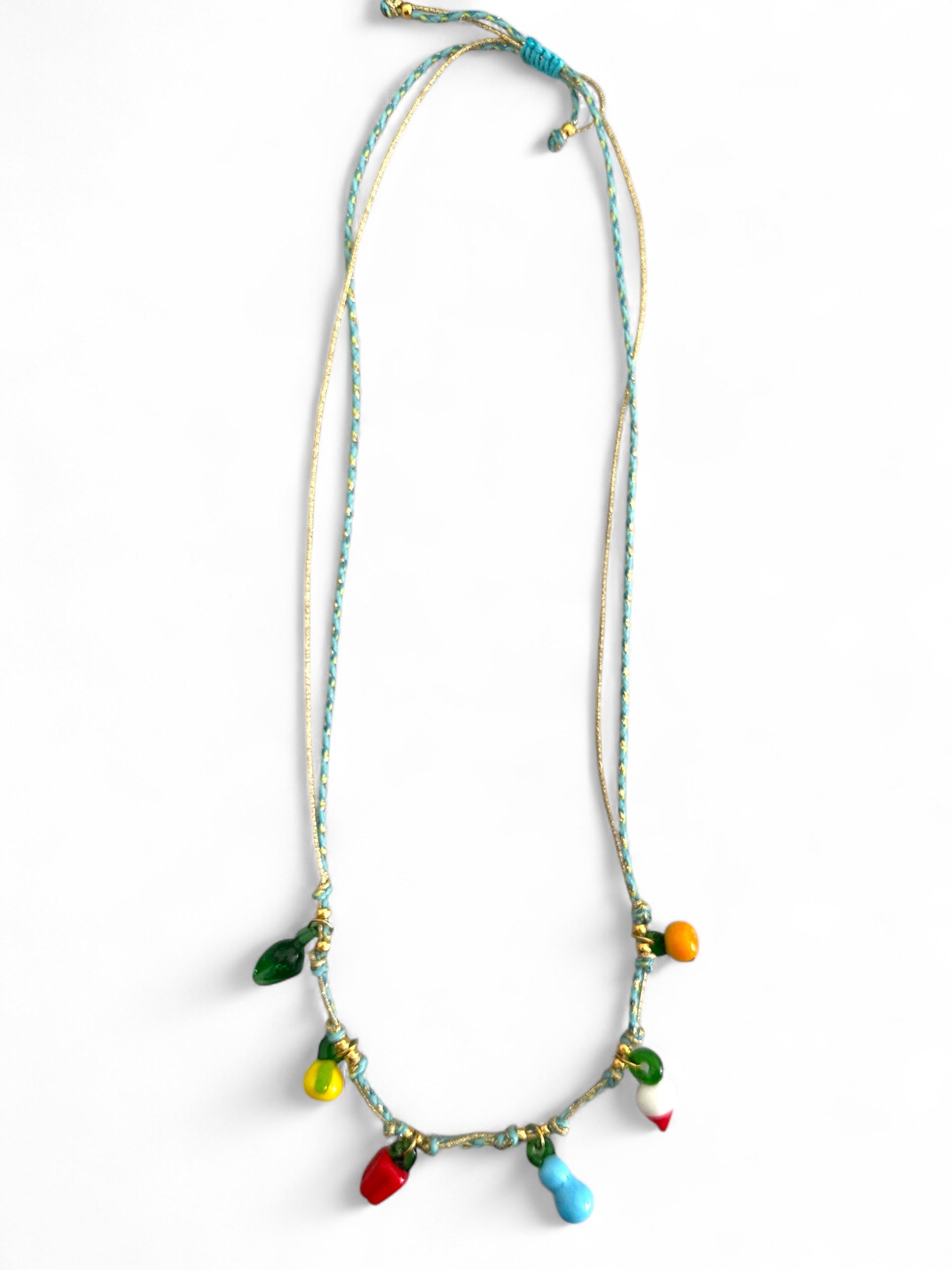 Statement κομμάτι alert! Ένα παιχνιδιάρικο χειροποίητο κολιέ που κλέβει την παράσταση, με πολύχρωμα γυάλινα μοτίφ σε σχήμα πιπεριών φτιαγμένα με την τεχνική lampwork. Τα πλεκτά κορδόνια σε διχρωμία δίνουν boho vibes με μια fun πινελιά, ενώ η αυξομείωση στο μήκος σου επιτρέπει να το φοράς όπως θες – κοντό ή πιο μακρύ.
