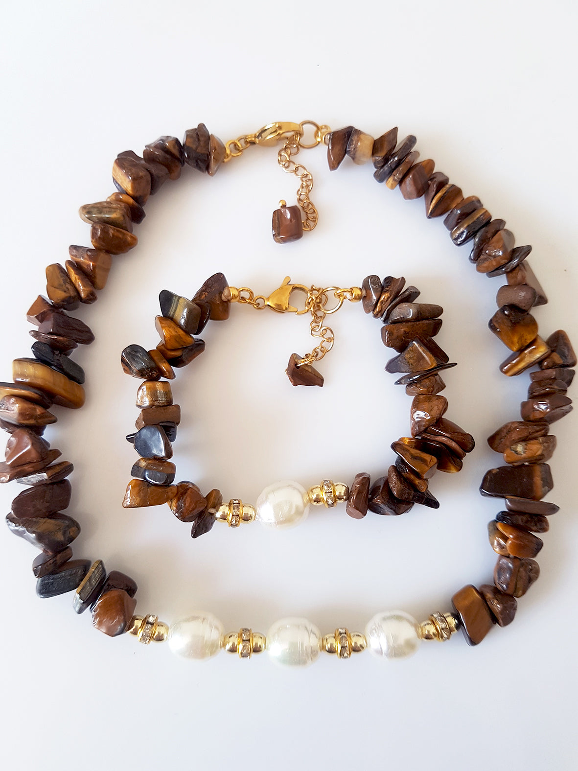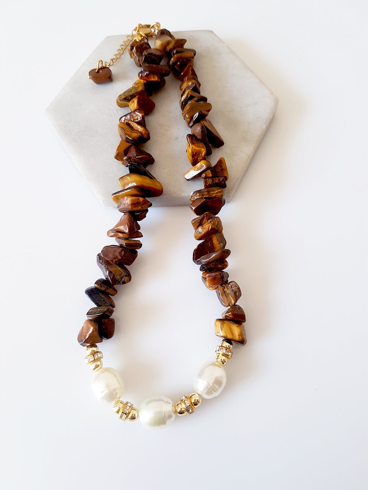 Χειροποίητο κολιέ με ακανόνιστα τσιπς από ημιπολύτιμη πέτρα tiger eye, χάντρες αιματίτη, δαχτυλίδια με στρας και ακρυλικές πέρλες. Διαθέτει ατσάλινο κούμπωμα και ατσάλινη αλυσίδα επέκτασης.
