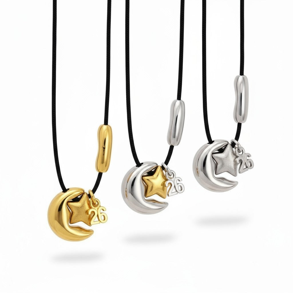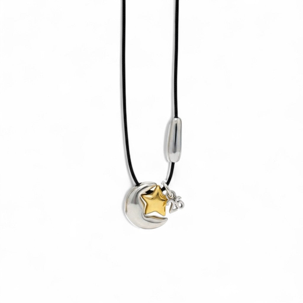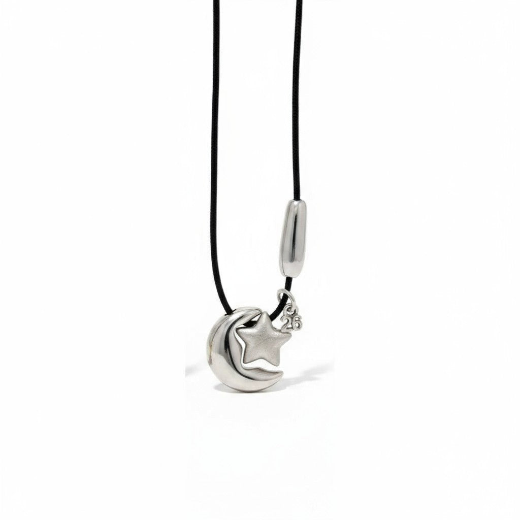 Minimal αλλά statement, με σελήνη και αστέρι σε λαμπερό ατσάλι, δεμένο σε μαύρο κορδόνι για μοντέρνα & fashion αισθητική.