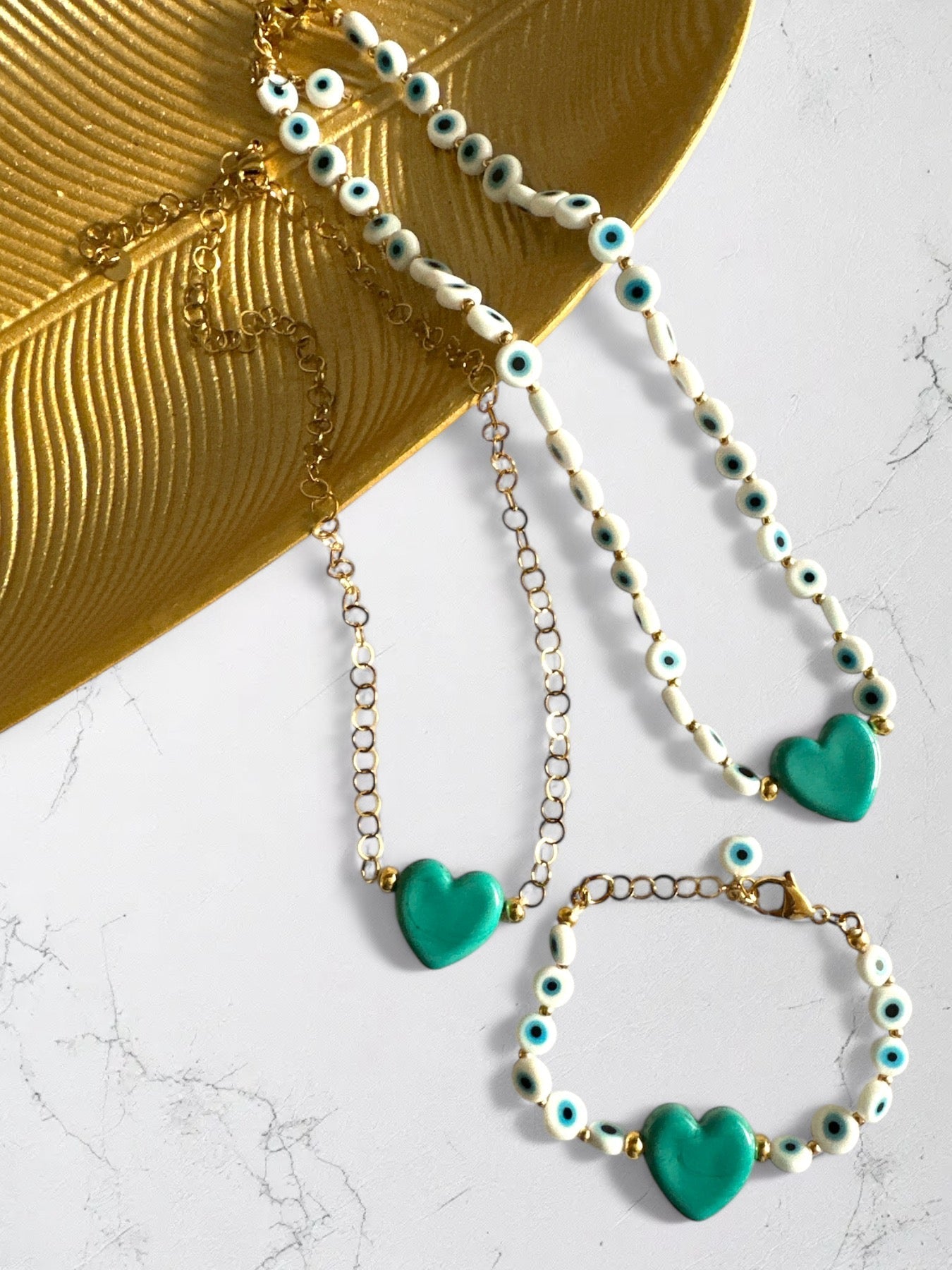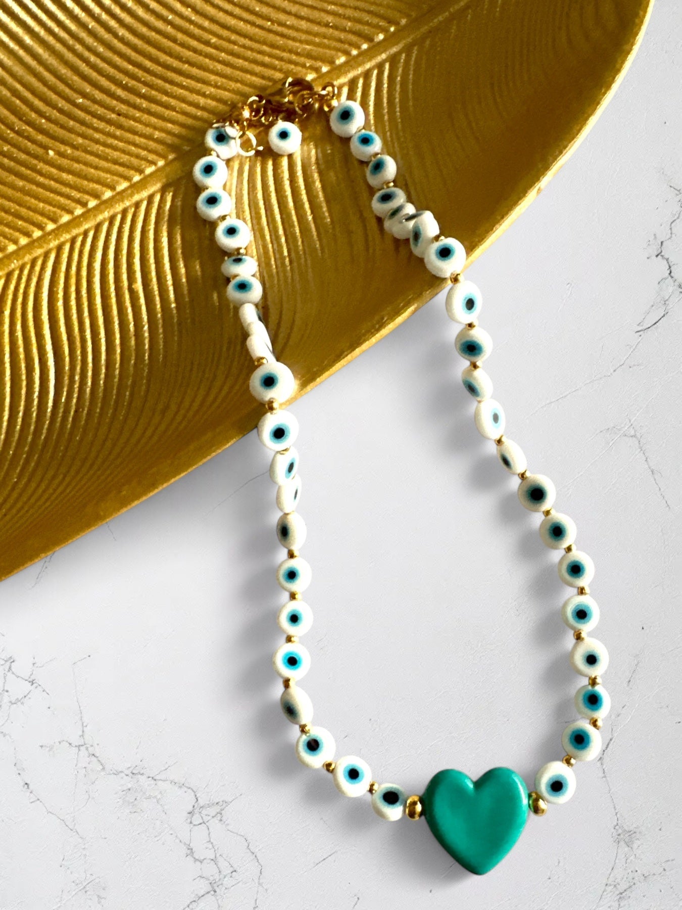 Χειροποίητο κολιέ με μάτι και τυρκουάζ καρδιά — για το πιο summer chic βλέμμα