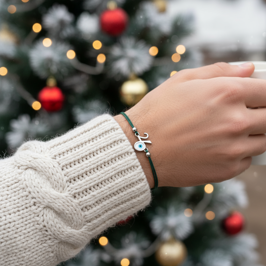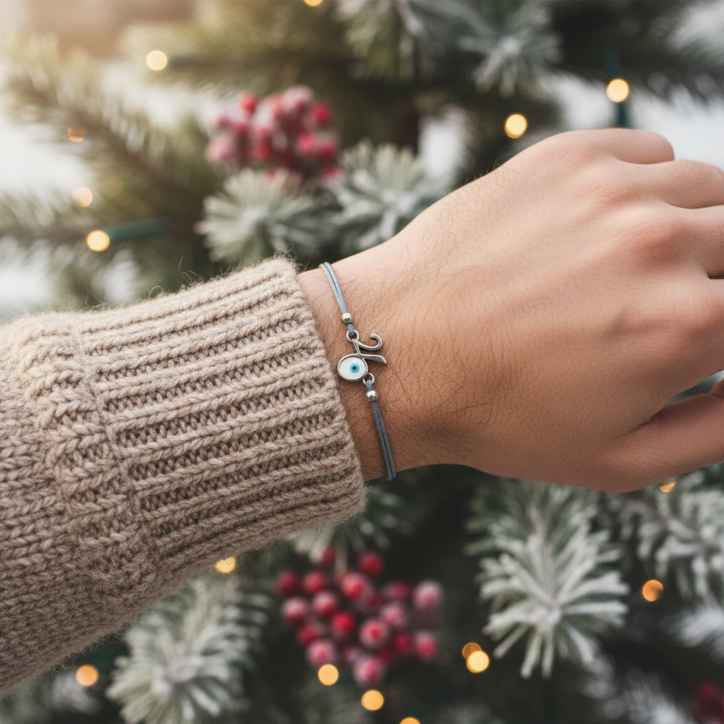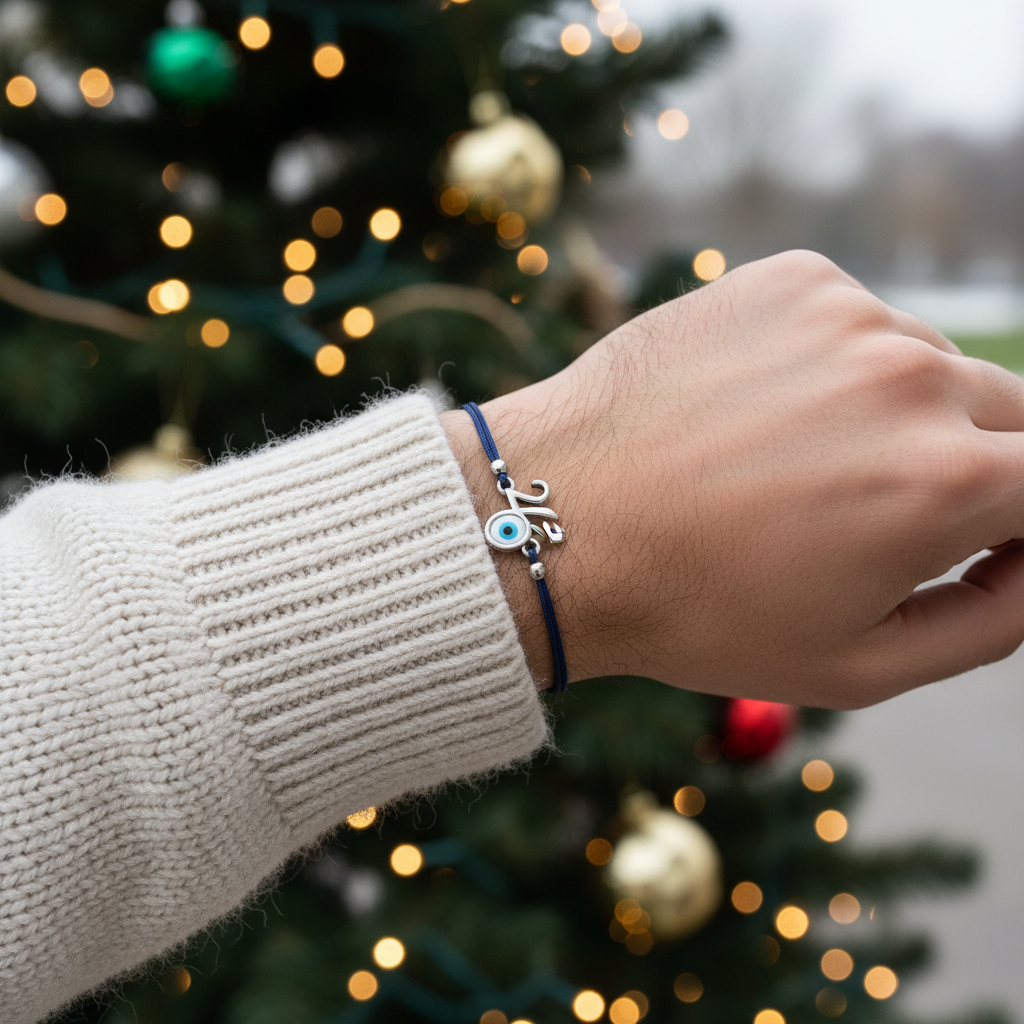 🤍✨Ανδρικό Βραχιόλι Γούρι 2026 με Μάτι & Χρωματιστό Κορδόνι – Silver Edition