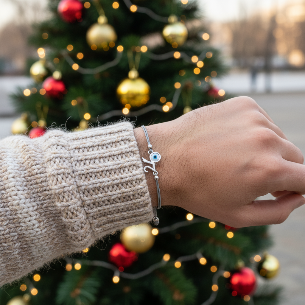 Aνδρικό χειροποίητο βραχιόλι-γούρι 2026 με μεταλλικό στοιχείο “26” και κεντρικό ματάκι.