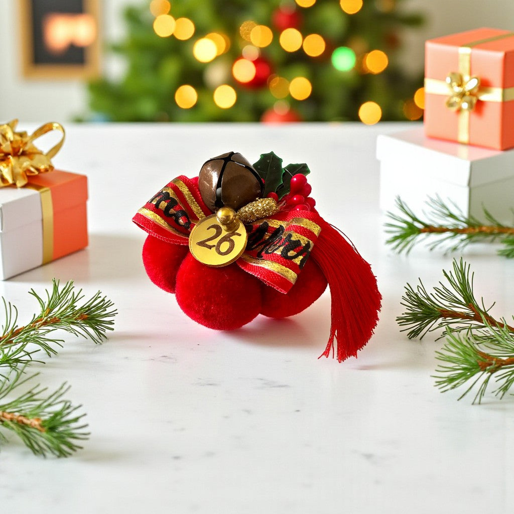 Χειροποίητη κόκκινη βελούδινη κολοκύθα, διακοσμημένη με φιόγκους, γκι, μεταλλικό κουδουνάκι και φούντα, σε festive ύφος που ξεχωρίζει.