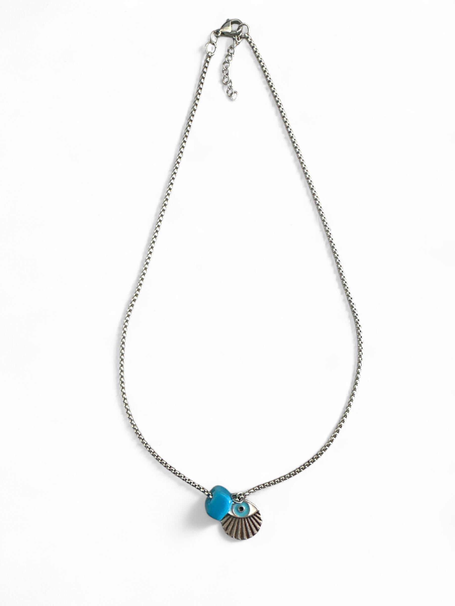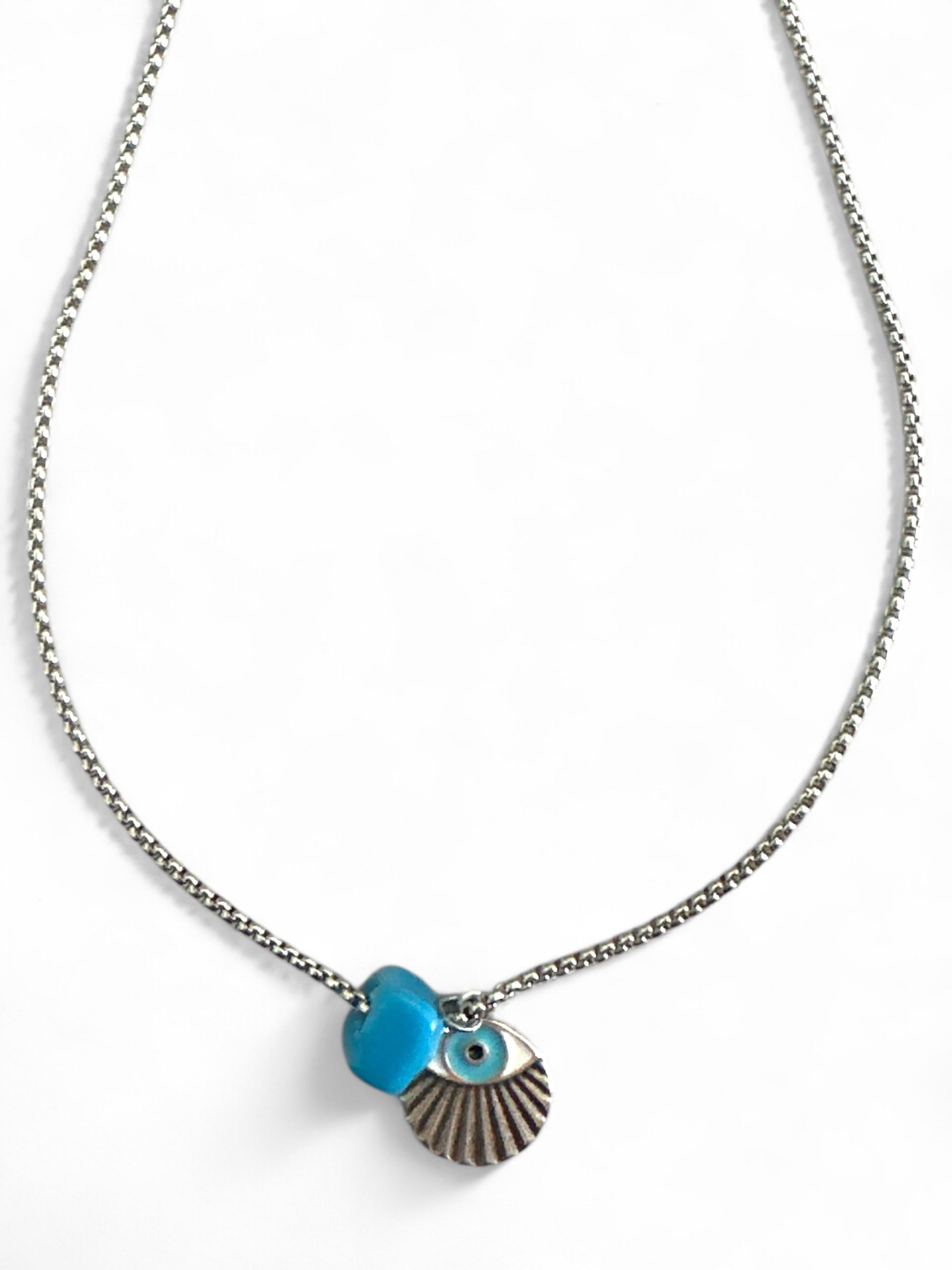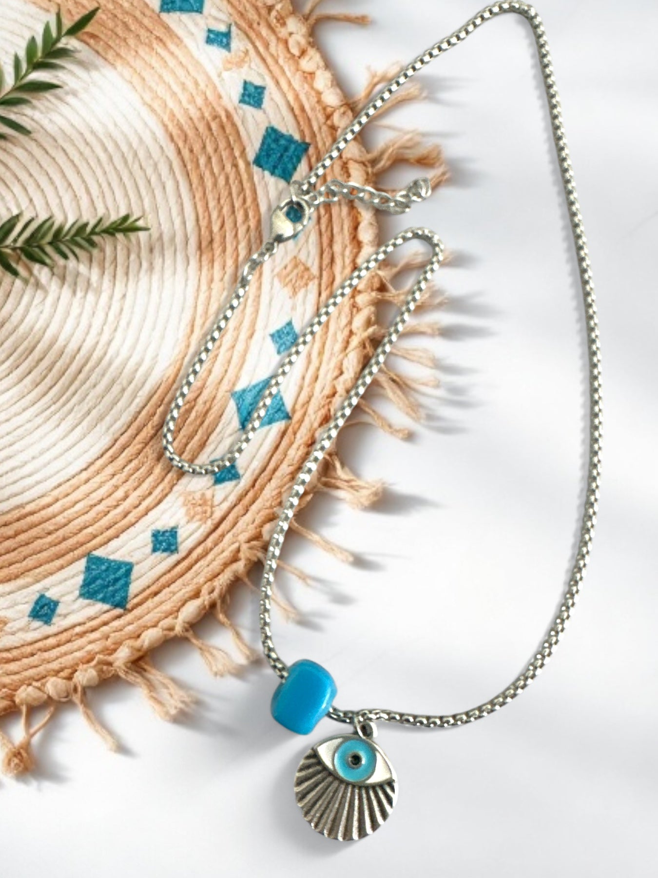 Minimal, κομψό και με boho διάθεση. Αυτό το χειροποίητο κολιέ συνδυάζει διακριτική λάμψη με συμβολισμό. Η λεπτή ατσάλινη αλυσίδα αναδεικνύει τον ακατέργαστο γυάλινο τυρκουάζ κύβο και το κυκλικό μοτίφ με ανάγλυφες ακτίνες και σμάλτινο μάτι σε έντονο τυρκουάζ. Ιδανικό για layering ή ως statement σε κάθε εμφάνιση.